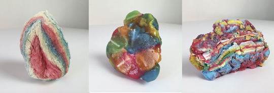 Sugar Geologies are small sculptures composed of candy – hypothetical specimens excavated during the Sucrose Period – expressing earth shaping forces such as compression, crustal deformation, deposition of sediment.